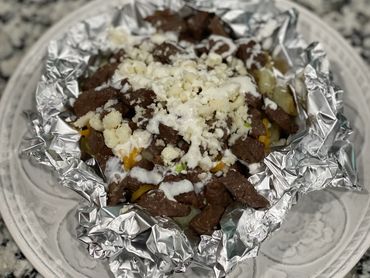Nacho chips topped with a twist of pinto beans, rice, Mexican cheese, sour cream, cilantro, tomatoes, avocado, jalapenos and topped with steak or choice of meat.